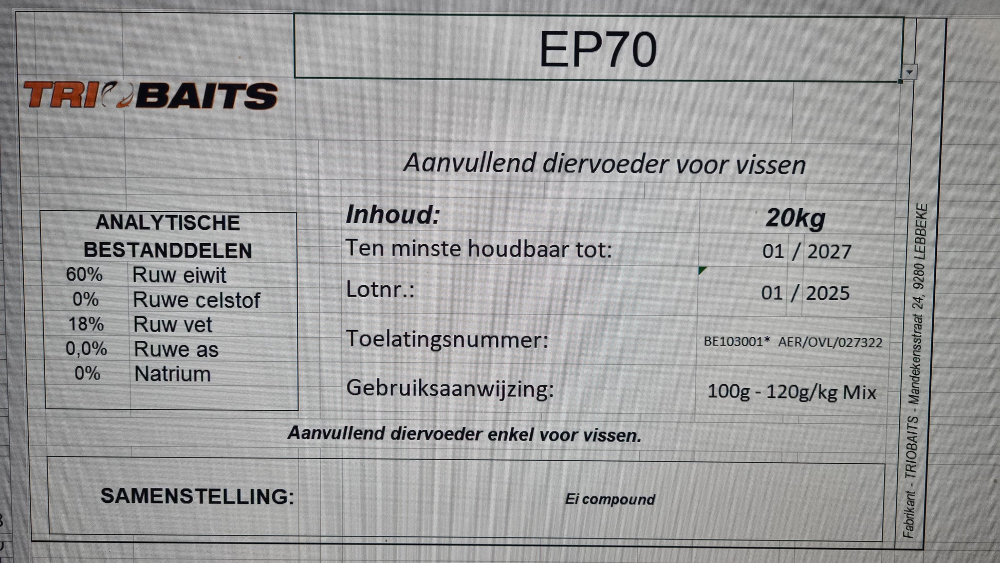 U kunt gebruik maken van normale eieren of bijvoorbeeld dit vers gepasteuriseerd product genaamd ei-compound/eivervanger. Door het mengen van veel eipoeder en ei-albumine is er een eimeel ontstaan waarmee perfect boilies gedraaid kunnen worden. Het enigszins vettig, geelkleurig ei-compound bezit geweldige bindende en uithardende eigenschappen. Egg Ep 70is een waardige ei-vervanger.
