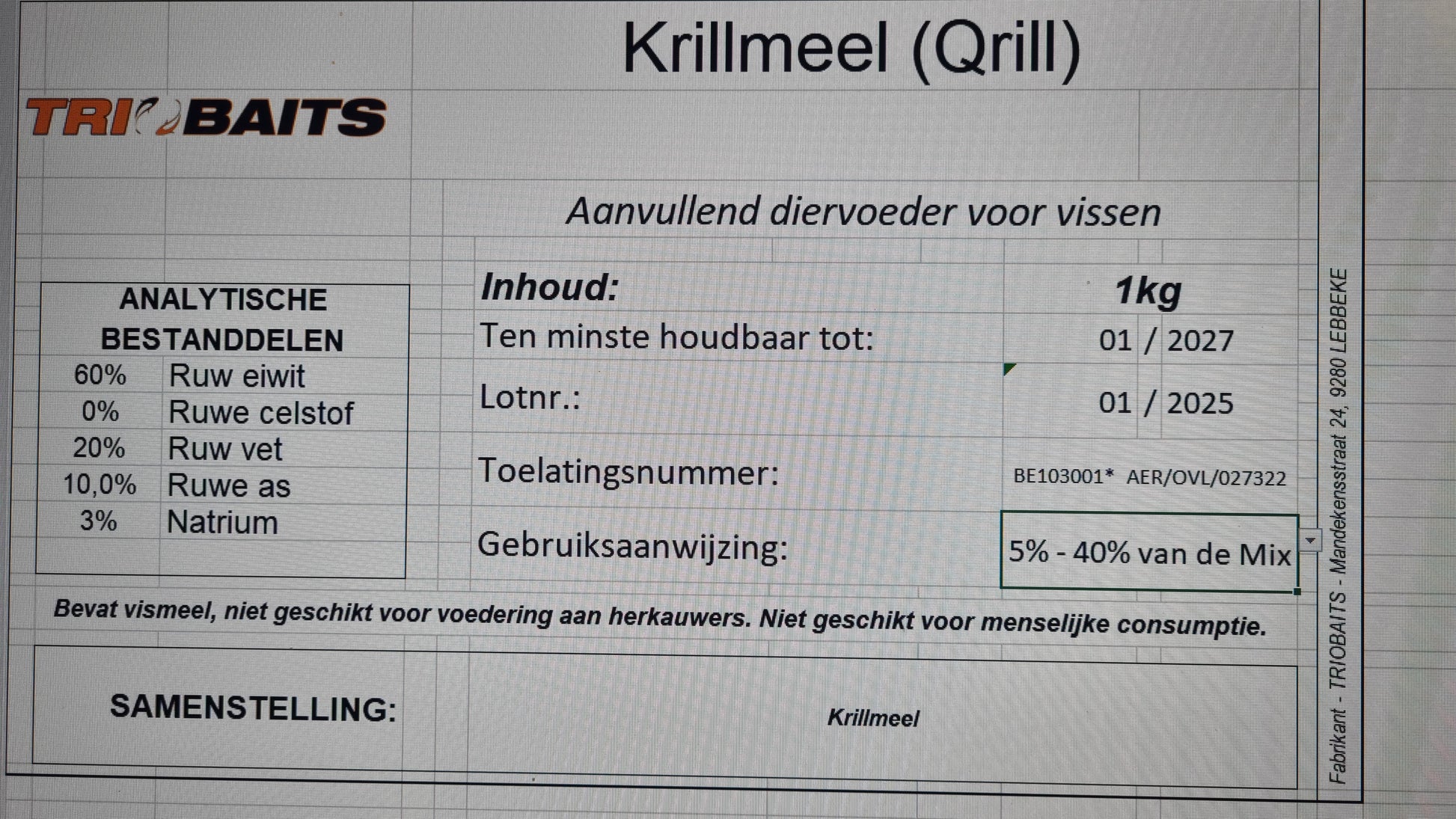 Wij voeren alleen het beste krillmeel wat er te verkrijgen is in. De heerlijke aroma's, die vrijkomen bij het openen van een zak zijn fenomenaal. Door het vlees van de garnaaltjes te verwerken ontstaat er een mooi roze, vleesachtig meel bomvol hoogwaardige eiwitten, aminozuren en essentiële vetten. Afhankelijk van het gewicht van de andere gebruikte ingrediënten is het zelfs mogelijk tot 30% krillmeel te verwerken in een bol.  Door de grove structuur en het absorberend vermogen is het zinvol eerst het deeg te laten rusten alvorens te verwerken.